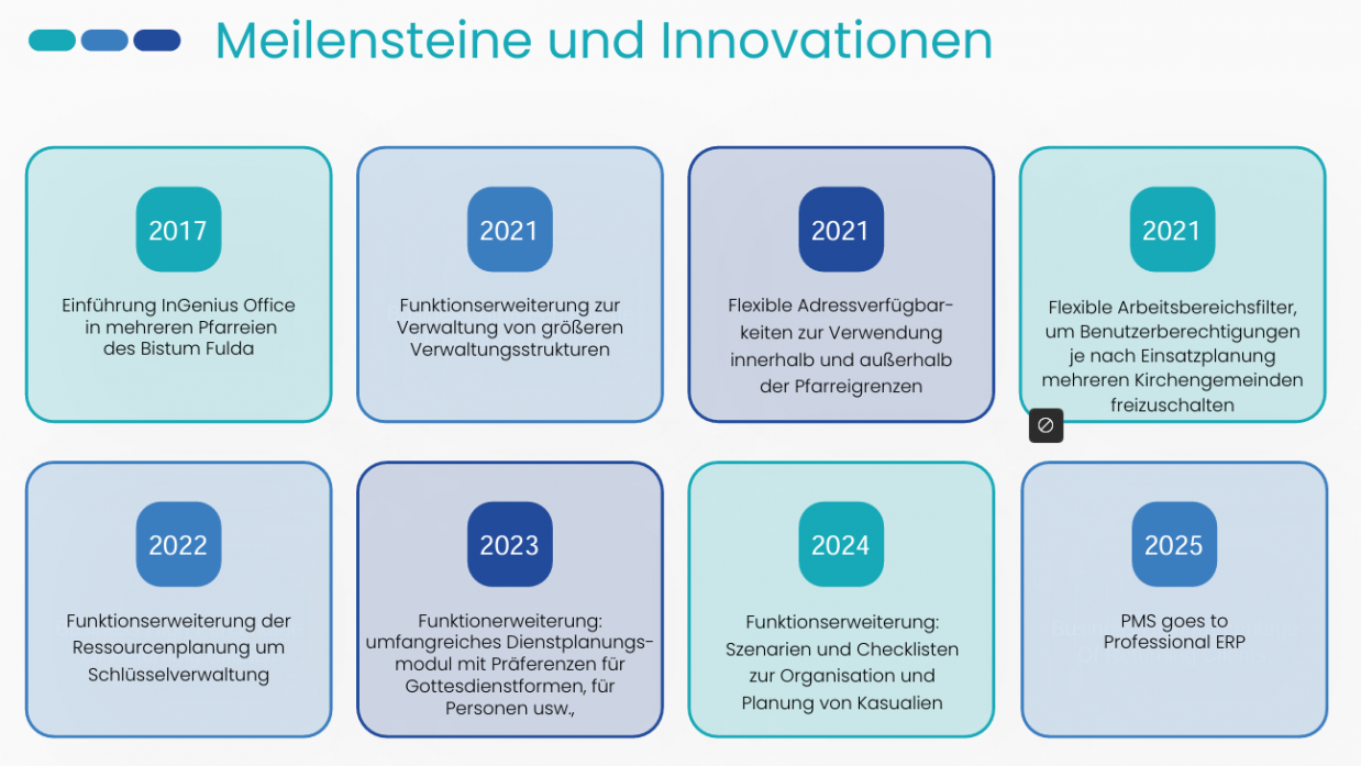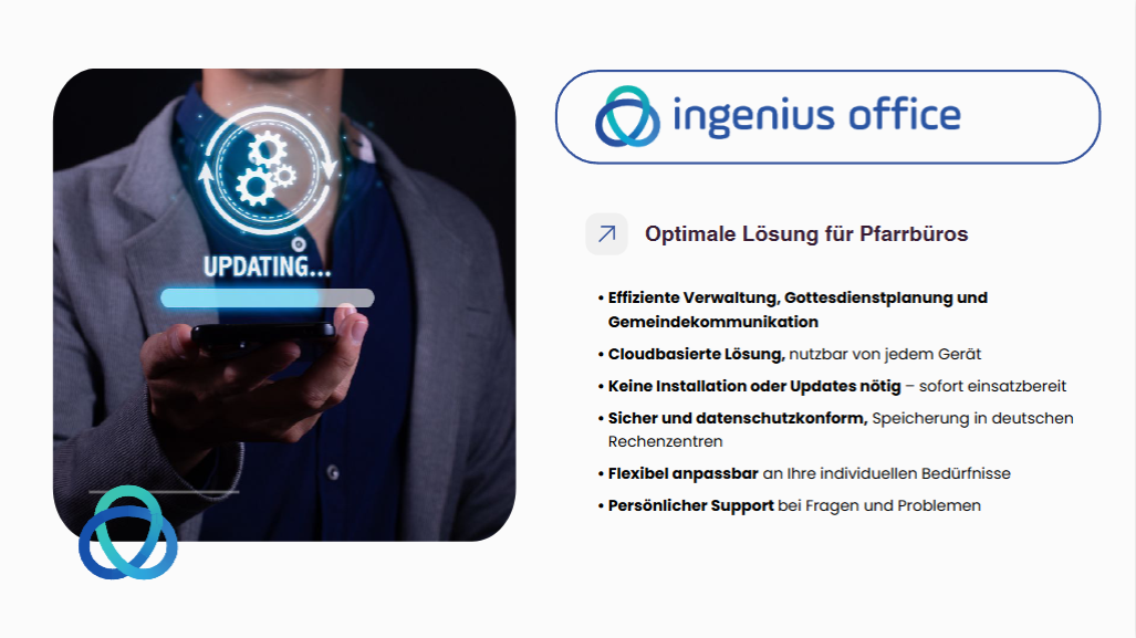 "In der heutigen schnelllebigen Zeit, in der Effizienz und Produktivität an erster Stelle stehen, erweist sich die InGenius-Office® Software als Leuchtturm der Innovation für die Kirchenverwaltung. Dieses ausge-klügelte System wurde entwickelt, um die komplexen und vielfältigen Aufgaben der Verwaltung kirchlicher Aktivitäten zu rationalisieren und mehr Zeit für die Seelsorge und das Engagement in der Gemeinschaft zu haben."