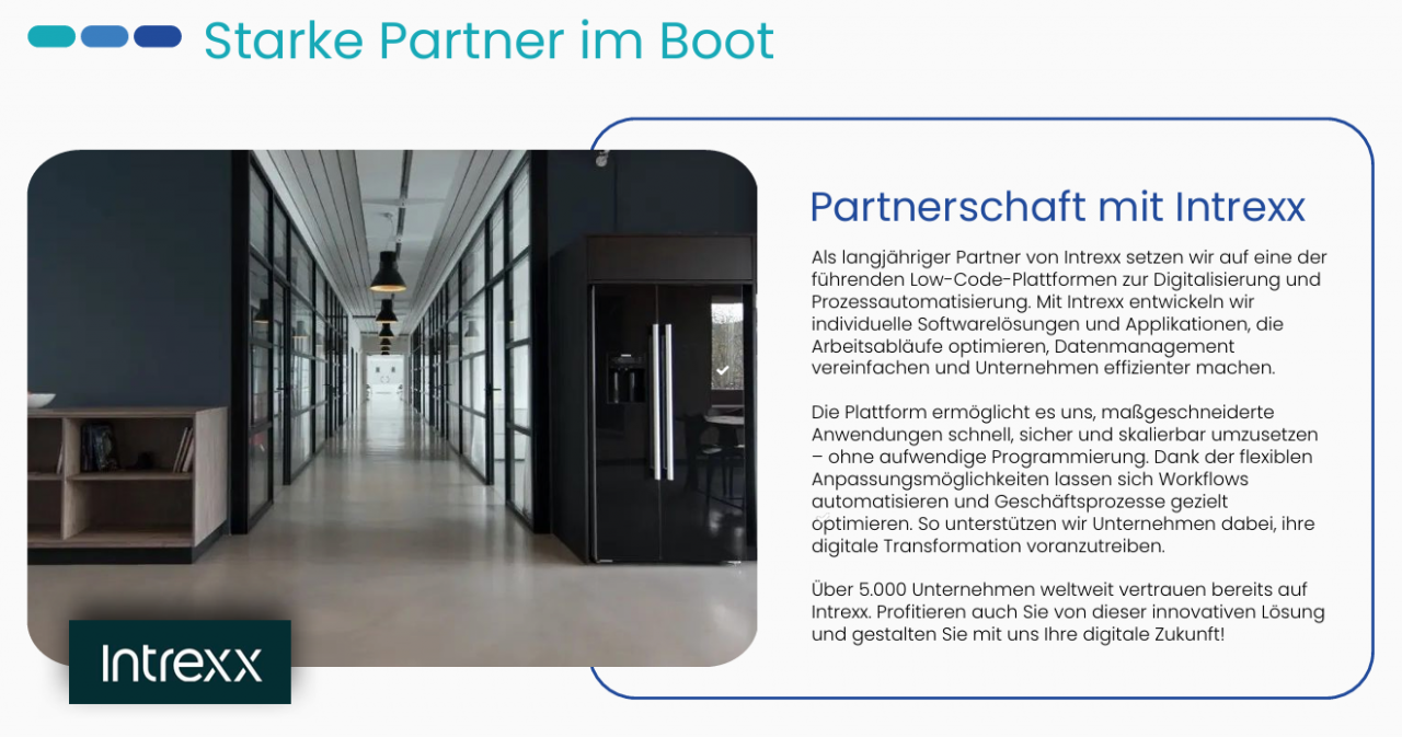 Intrexx ist die Low-Code-Plattform, mit der Sie Applikationen und individuelle Software für Ihr Unternehmen umsetzen. Beginnen Sie mit der Problemlösung und optimieren Sie Prozesse und Workflows ganz einfach - standardisiert, sicher und skalierbar.